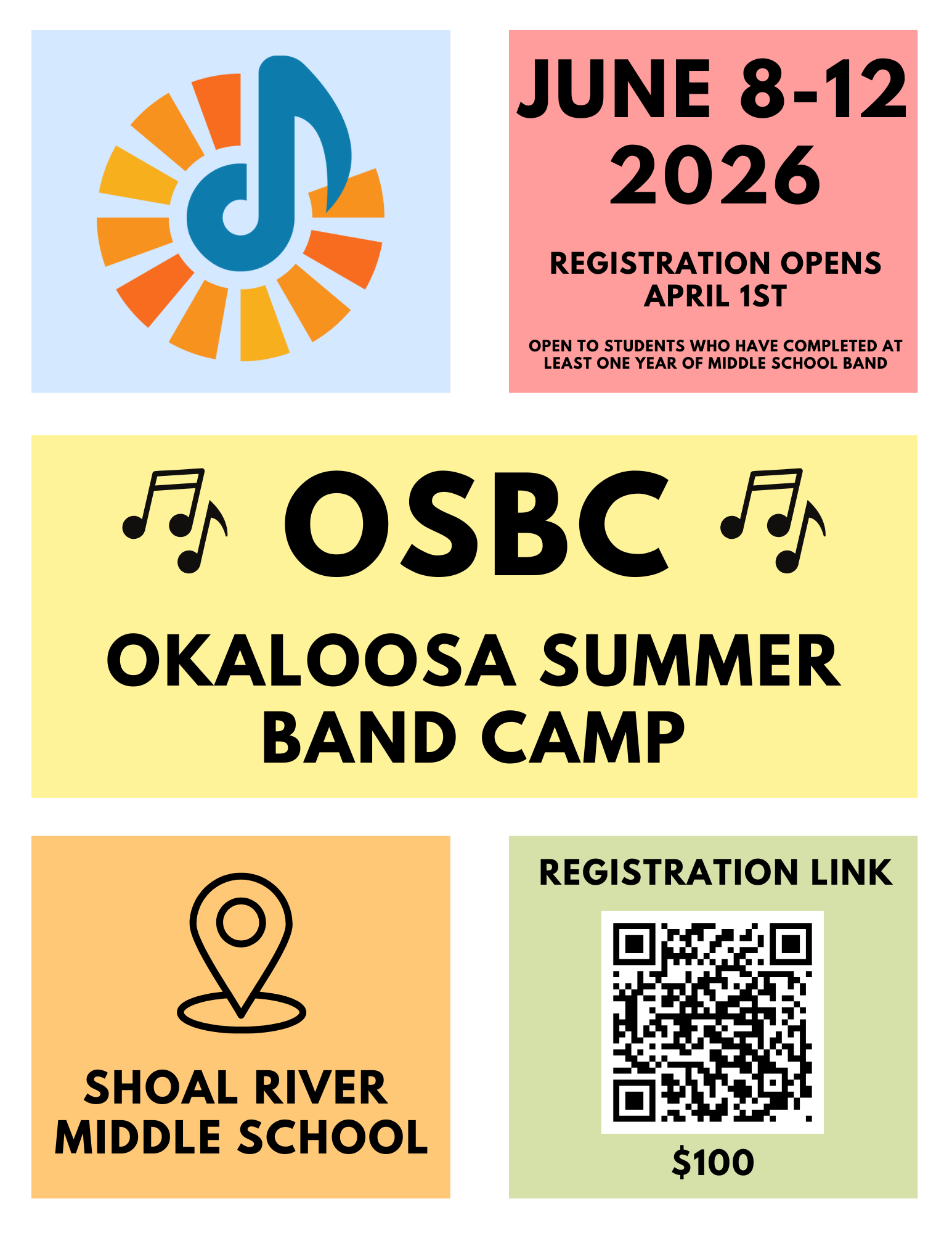 This camp was founded in 2017 by Mr. Steadman, Ms. Whaley, and Ms. Leffard with the goal of providing a high-quality, affordable local band camp. After a brief pause in 2020 and 2021, the camp returned and is now entering its seventh year! Organized by Okaloosa County band directors and supported by local high school mentors, this camp offers students a fantastic opportunity to stay engaged in music over the summer. Participants gain valuable experiences, explore new music and instruction, build friendships, and enhance their musicianship.